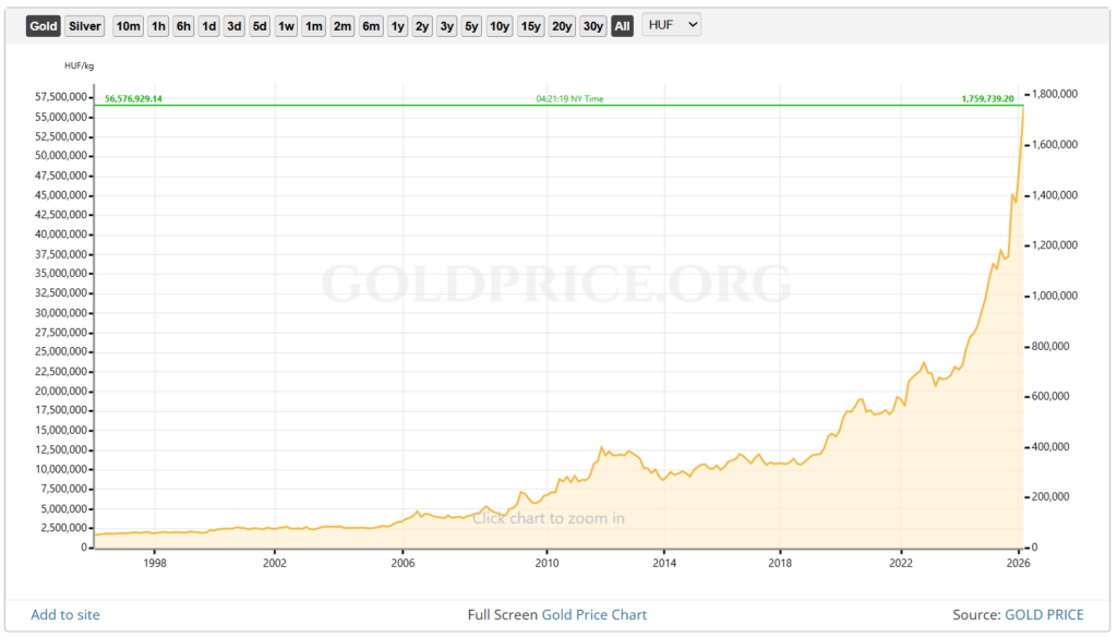 Az alábbi grafikonon (a kép bal alsó részén) jól látszik, hogy 1 kg arany ára 2000-ben 2 millió forint körül volt, míg most, 2026 márciusában 56 millió forint körül alaul (felső zöld sáv). Ez 25 év alatt, több mint 2700%-os növekedés. És ez még messze nem a vége! Kell ennél jobb nyugdíjterv?